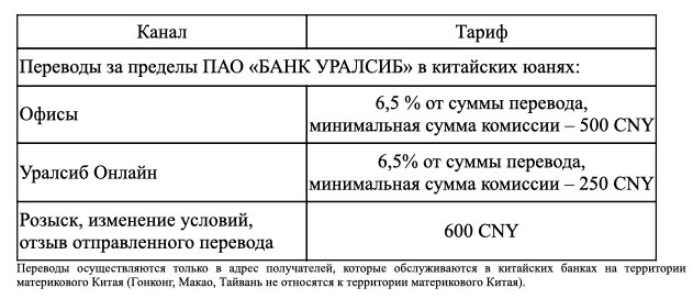 C 10.03.2025 года вносятся изменения в тарифы расчетно-кассового обслуживания физических лиц ПАО «БАНК УРАЛСИБ» по переводам денежных средств со счетов за пределы ПАО «БАНК УРАЛСИБ», в китайских юанях: