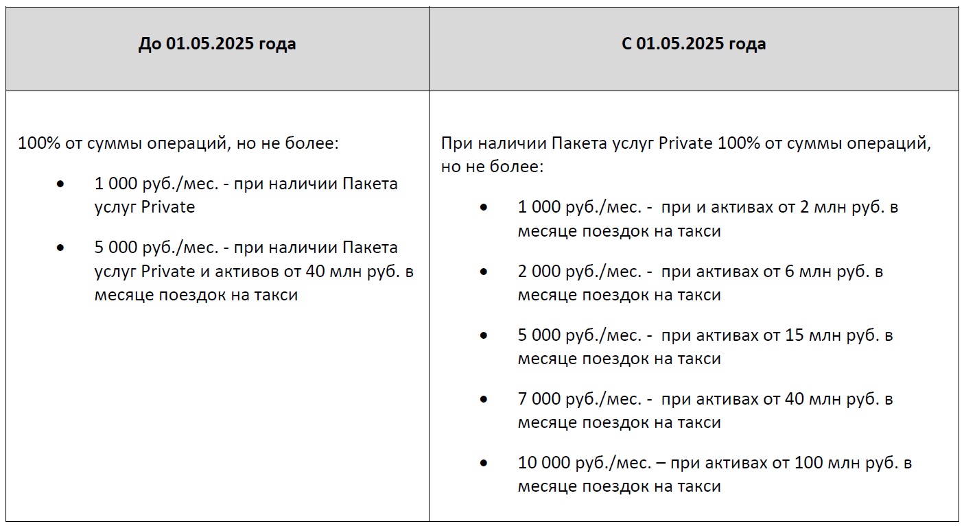 пакетам услуг Private в части начисления кешбэка за поездки на такси с 1 мая 2025