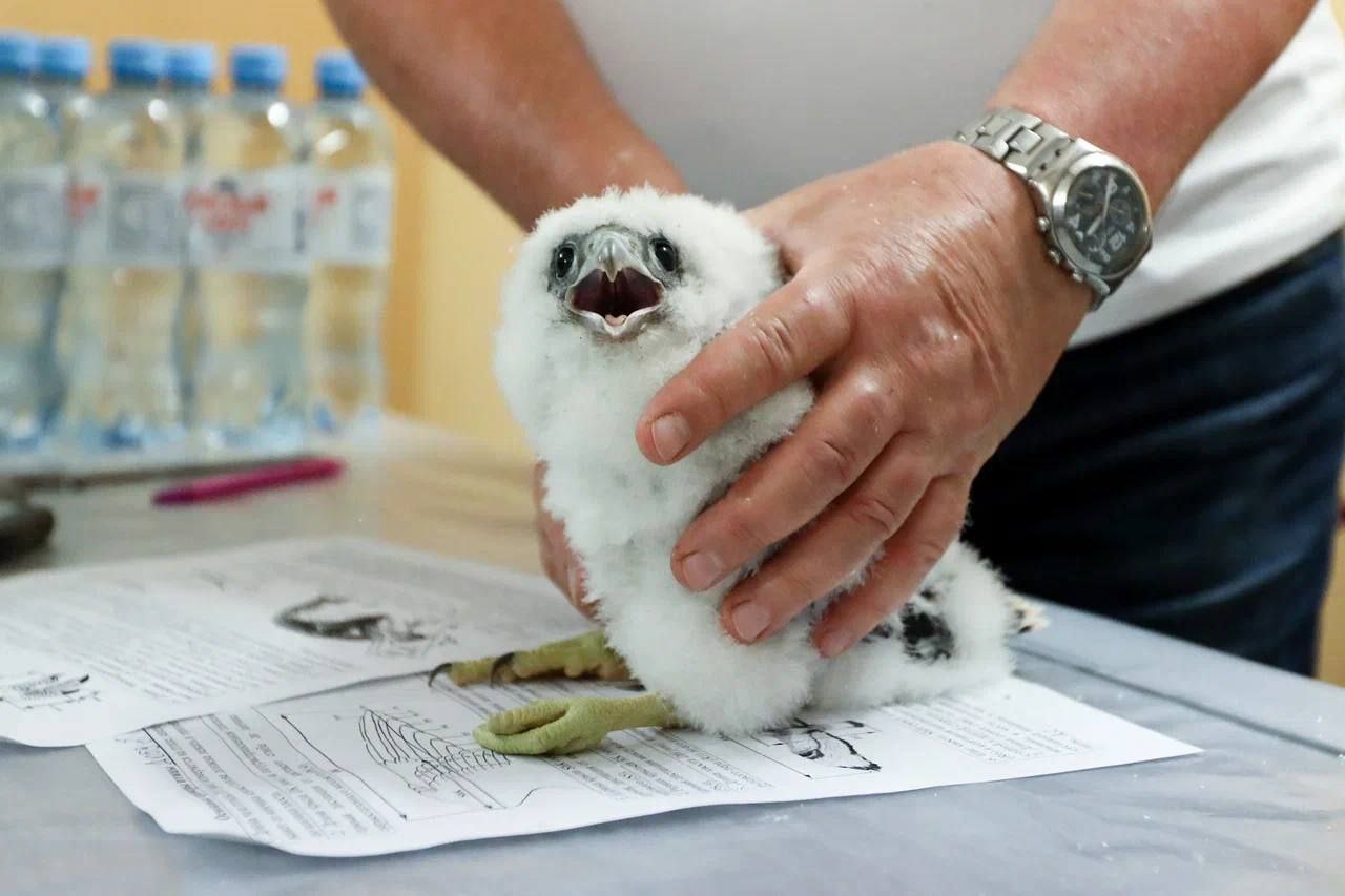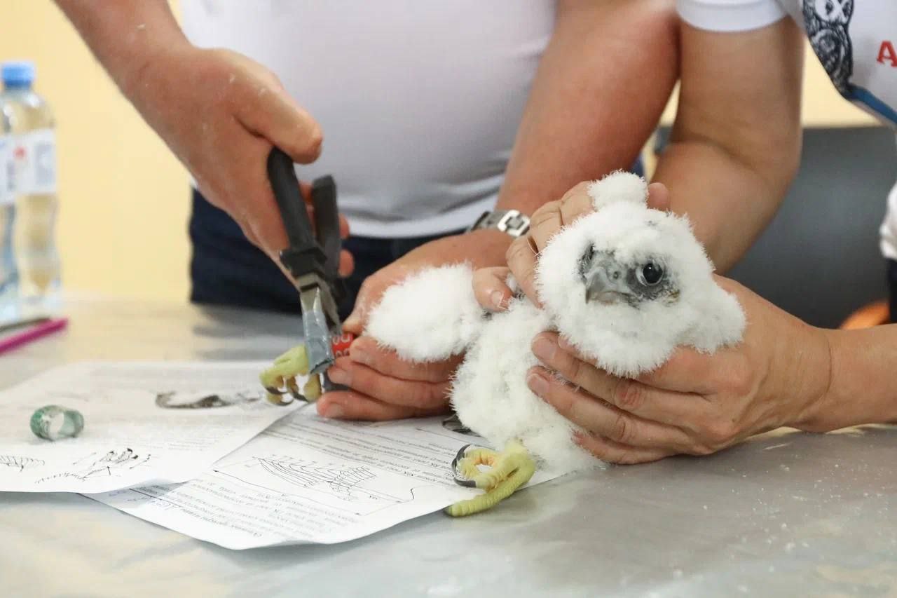 Птенцов кольцуют в возрасте 3 недель, так как в этот период они способны перенести стресс и быстро восстановиться. Перед тем, как получить свое кольцо на лапку, у птенца были зафиксированы индивидуальные параметры: вес, размах крыльев, состояние оперения. Эти научные данные будут изучаться орнитологами, которые интересуются гнездованием хищных птиц в городе. На лапки птенца закрепили небольшие кольца с цветовыми метками региона – красный цвет кольца на одной лапке и бело-зеленый на другой, что означают Волго-Уральский регион. Они практически не имеют веса и не мешают ему. После определения пола птенца, который оказался самцом, ему присвоили номер D-059.