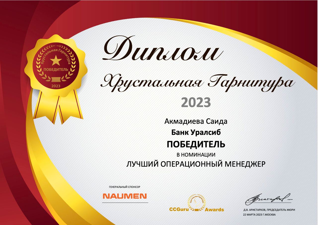 Руководитель Центра дистанционного обслуживания бизнеса Банка Уралсиб Саида Акмадиева стала победителем премии «Хрустальная гарнитура» в номинации «Лучший операционный менеджер».